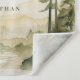 Personalized wedding tapestry depicts a casual nature watercolor design including a simple stream of water surrounded by forest pine trees and mountains in earth tone shades of sage, green and tan. It features Bible Verse Song of Solomon 3:4, "I have found the one whom my soul loves." Customize the tapestry with names.