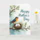 This design shows a detailed songbird perched close to a rustic woven nest that holds two smooth white eggs, as if keeping a gentle watch ❤️. The bird has a blue‑gray cap and back, a warm orange breast that fades into a pale belly, and wings marked with black-and-white stripes. It rests on a sturdy tree branch surrounded by rich green leaves and small white blossoms, with a few petals drifting through the air 🌼. The background is a soft wash of light blue and white, and faint floral outlines sit in the distance like quiet echoes behind the main scene. On the right side, the words “Happy Mother’s Day” appear in flowing lettering, set apart from the artwork and easy to spot. The text is a dark, medium-toned color that contrasts gently against the pale background, leaving the bird and nest to fill the left side with a tender, caring mood. Tiny white blossoms cluster near the upper branches while a couple of petals float across the open space beside the message.