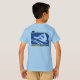 A silhouette of a surfer doing a trick off a graphic wave. There is a companion print on the front of the t-shirt. This design comes in three colorways.