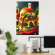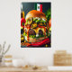 Get ready for a flavor explosion with this Sonora Spice Bomb burger. A thick spiced beef patty, grilled to savory perfection, is topped with melted Oaxaca cheese, roasted jalapeños, a generous smear of chipotle mayo, and fresh avocado. All nestled inside a toasted corn-dusted bun. A small Mexican flag adds a festive touch, while a blurred background hints at chili peppers and fresh cilantro, completing this Mexican culinary delight.