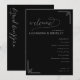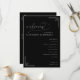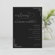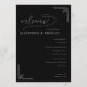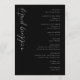 This wedding program features a sophisticated, monochromatic design with a deep black background and crisp white text, creating an elegant contrast. The layout is centered with ample negative space, enhancing focus on the content, which includes customizable names and event details. Decorative geometric accents in the corners add subtle visual interest, while the mix of cursive and sans-serif fonts balances elegance and readability. Perfect for a formal wedding ceremony, this design conveys a mood of sophistication and refinement.