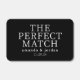 This wedding match design features a sleek, minimalist black background with crisp white text for a modern and elegant look. The layout is simple and symmetrical, emphasizing clean lines and ample negative space around the text elements. With a sans-serif font that enhances readability and sophistication, this design conveys a mood of anticipation and celebration, perfect for commemorating your special day. The customizable nature allows you to personalize it with names and dates, making it an ideal keepsake for any couple.