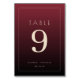 This elegant wedding table card features a minimalist design with a deep burgundy gradient background and cream-colored text. The layout is centered around the large, bold number "9," with the word "TABLE" above it in uppercase serif font. Below the number, customizable names and date are presented in a smaller yet refined typeface, adding a touch of sophistication. The clean lines and balanced composition create a formal and inviting atmosphere, perfect for enhancing your event's decor.