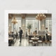 The watercolor painting exudes the serene elegance of The Gilded Cup café in San Francisco's Financial District. Inside, sleek marble countertops and ornate crystal chandeliers create an atmosphere of sophistication. A man in a charcoal suit sips a flat white by the window, while a woman in a white blouse and silk scarf scrolls through her tablet next to a porcelain teapot. The barista, dressed in black, operates a gleaming brass espresso machine at the counter. At another table, a group of colleagues shares a charcuterie board, their polished leather briefcases neatly placed nearby. Floor-to-ceiling windows reveal the bustling streets of San Francisco, framed by a palette of muted grays and illuminated by golden light. The lush greenery of fiddle-leaf figs and orchids adds a fresh, natural touch to the luxurious scene.