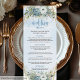 Pair with matching invitations, place cards, and table numbers for a cohesive, stylish look. Make your reception unforgettable with this dusty blue and gold floral menu — the perfect finishing touch for your elegant wedding day.