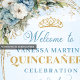 Ideal for classic, modern, garden, or formal Quinceañera themes, this welcome sign enhances the entrance, gift table, or party display with sophistication and charm. The greenery and eucalyptus elements add a natural, calming touch, while the gold accents provide a subtle sparkle that elevates the décor. Whether displayed on an easel, framed as a poster, or used as a focal backdrop, it sets a warm and inviting tone for the celebration.