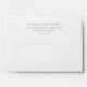 This wedding envelope features a minimalist design with a clean, modern aesthetic. The layout is simple and symmetrical, showcasing elegant serif typography in soft gray hues against a white background. With ample negative space, the design emphasizes clarity and sophistication, making it perfect for couples seeking an understated yet refined look. Customizable text fields allow personalization for names, addresses, and locations, ensuring each envelope reflects the unique details of your special day. Ideal for weddings that celebrate elegance through simplicity.