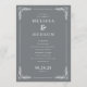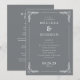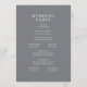 This elegant wedding program features a sophisticated, vertically oriented layout with a muted gray background and crisp white text. The design includes ornate vine-like borders at the top corners, adding a touch of organic elegance. A mix of serif and sans-serif fonts creates a modern yet formal aesthetic, guiding the eye through customizable sections for names, ceremony details, date, and location. Perfect for couples seeking a refined and understated look, this template blends traditional formality with contemporary simplicity, ideal for any formal wedding occasion.