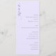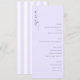 This elegant wedding menu features a minimalist design with a soft lavender background, creating a serene and sophisticated atmosphere. The layout is clean and structured, with distinct sections for starters, salad, main course, and dessert, each highlighted by clear headings in uppercase sans-serif font. The text is presented in an inviting serif style, enhancing readability while maintaining a refined aesthetic. Perfect for formal dining experiences, this menu exudes calmness and elegance through its muted color palette and ample negative space, making it ideal for weddings or upscale events.