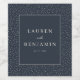 This elegant wedding wine label features a sophisticated navy blue background adorned with a subtle grid of white dots, creating a refined border. The design showcases centered text in an elegant serif font, allowing for customizable names and dates to be displayed prominently. Its minimalist style emphasizes clarity and balance, making it perfect for celebrating your special day with a touch of timeless charm. Ideal for weddings, this label adds a formal yet understated aesthetic to any bottle, capturing the joyous occasion beautifully.