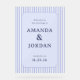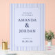 This wedding sign features a modern, minimalist design with vertical light blue and white stripes framing a central pale lavender rectangle. The layout is clean and elegant, using a classic serif font to highlight the event details in a sophisticated manner. Perfect for welcoming guests at a wedding, this sign combines soft pastel colors with a refined aesthetic, creating an inviting and serene atmosphere. Its customizable text allows you to personalize it for any special occasion, making it a versatile addition to your celebration decor.