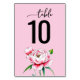 This wedding table card features a simple yet elegant design with a solid pink background. The layout includes stylized cursive text reading "table" above bold, black numerals indicating the table number, creating a sophisticated contrast. At the bottom, two beautifully illustrated peonies add a touch of natural elegance, enhancing the overall theme of gentle luxury and warmth. Perfect for adding a refined touch to your wedding reception, this card combines botanical charm with minimalist aesthetics.
