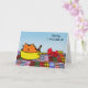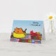 Belated birthday wishes paper greeting card with cat / feline theme of a cat curled up in a yellow pan. A big red bow is tied on the handle and a bright and colorful madras plaid patterned tablecloth is beneath. Cat/Pan elements thanks to:NetRat/Openclipart. © Shoaff Ballanger Studios.