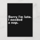 Grab this "Sorry I'm late. I needed a nap." funny saying tee shirt For anyone who considers sleep a priority, not a privilege. Show your sense of humor by wearing this basic cool text style. for Black and White Contemporary Art Lovers. I'm sure that it can spark many conversations and will help with breaking the ice. This funny awkward design is a great gift idea for employees, colleagues, coworkers, managers, supervisors, friends, or family, and also makes a great birthday, holiday gift, or Christmas present. Celebrate any occasion with a touch of personality and comfort! (YOU CAN CHANGE AND CUSTOMIZE THIS TEXT DESIGN OR ANY TEXT YOU WANT IN TEXTIFY STORE!).