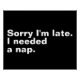 Grab this "Sorry I'm late. I needed a nap." funny saying tee shirt For anyone who considers sleep a priority, not a privilege. Show your sense of humor by wearing this basic cool text style. for Black and White Contemporary Art Lovers. I'm sure that it can spark many conversations and will help with breaking the ice. This funny awkward design is a great gift idea for employees, colleagues, coworkers, managers, supervisors, friends, or family, and also makes a great birthday, holiday gift, or Christmas present. Celebrate any occasion with a touch of personality and comfort! (YOU CAN CHANGE AND CUSTOMIZE THIS TEXT DESIGN OR ANY TEXT YOU WANT IN TEXTIFY STORE!).
