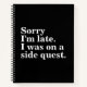 Grab this "Sorry I'm late. I was on a side quest" funny saying tee shirt to show your sense of humor by wearing this basic cool text style. for Black and White Contemporary Art Lovers. I'm sure that it can spark many conversations and will help with breaking the ice. This funny design is a great gift idea for gamer introverts friends or family, and also makes a great birthday, holiday gift, or Christmas present. (YOU CAN CHANGE AND CUSTOMIZE THIS TEXT DESIGN OR ANY TEXT YOU WANT IN MY STORE!).