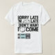 This fun and sarcastic design features the phrase "Sorry I'm Late, I Didn't Want to Come" with a melting or broken clock illustration, symbolizing lateness and reluctance. The design blends bold block