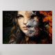Female portrait with a face in fragmented layers, revealing diverse textures and colors, suggesting multiple facets of identity and emotion.