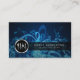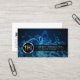 This dark themed sound engineer business card features a chrome icon of a volume sliders enclosed within a chrome circle over a dark background of jumbled music notes. Your business name and text/tagline appear within a black text panel strip that runs from the icon from the left towards the right edge of the card. The background of the card consists of a dark themed grunge pattern. Your contact details appear on the lower left on the back of the card. Perfect for music, musician, entertainment, show business, arts, artistic, professional, impact, dark themes.
