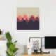 A design made up of irregular wave or hill like shapes arranged like a landscape with a progression of bands one behind or on top of another abstractly playing with color and space. The design is also very reminiscent of sound and music with the wave like shapes and harmonising colours.
