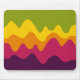 A design made up of irregular wave or hill like shapes arranged like a landscape with a progression of bands one behind or on top of another abstractly playing with color and space. The design is also very reminiscent of sound and music with the wave like shapes and harmonising colours.