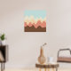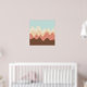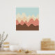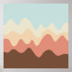 A design made up of irregular wave or hill like shapes arranged like a landscape with a progression of bands one behind or on top of another abstractly playing with color and space. The design is also very reminiscent of sound and music with the wave like shapes and harmonising colours.