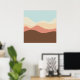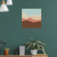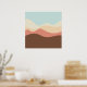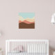 A design made up of irregular wave or hill like shapes arranged like a landscape with a progression of bands one behind or on top of another abstractly playing with color and space. The design is also very reminiscent of sound and music with the wave like shapes and harmonising colours.