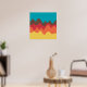 A design made up of irregular wave or hill like shapes arranged like a landscape with a progression of bands one behind or on top of another abstractly playing with color and space. The design is also very reminiscent of sound and music with the wave like shapes and harmonising colours.