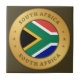 The South African flag is inset into a rounded faux gold ring. The words "South Africa" feature at the top and bottom of the design, and are of a pressed effect. The pair of three decorative stars across from each other, are also designed with a pressed effect.