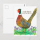 A postcard decorated with a colorful ring-necked pheasant in a patch of purple pasque flower illustrated with ink and watercolor. Inspired by the state bird and state flower of South Dakota.