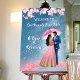 South Indian wedding reception welcome sign board template Indian couple with umbrella falling petals, cartoon characters romantic welcome to our happily ever after personalized welcome board template blue and pink