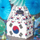The South Korean flag is a white field with in the center an emblem and four trigrams on each corner of the flag. The used colors in the flag are blue, red, white, black. The proportion of the South Korean flag is 3:2. The Flag of South Korea was adopted in 1883. The first use of the current flag design was in 1882. The last change to the current South Korean flag design was in 1948.