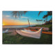 This photo features a sailboat docked on the sand at South Bay Beach at sunset in Maui, Hawaii.