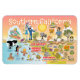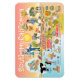 Bright and colorful scene offers a spectacular view of Southern California - wacky characters frolic on the beach and desert of SoCal showcasing Los Angeles, Orange County, San Diego, Santa Barbara, Riverside, Palm Springs, El Centro, Salton Sea, Anza Borrego and Joshua Tree parks as well as the border cities of Tijuana, Tecate and Mexicali. This charming scene has it all – a surfer hangs ten while a killer whale leaps out of the water, zoo animals greet the tourists, wine lovers make a toast as a hiker is noticed by a UFO and much more…