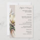 Wedding menu with a southern theme. White magnolia flowers decorate the edge on pink-beige paper. Menu text is aligned to the right side. Personalize with names of the couple at the top. Title and date are in bold printed font, with all menu items listed in paragraph form. Add, and remove, spaces as needed for your event. Reverse is solid very dark green. Also comes as an instant download to print your own, or share online.