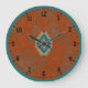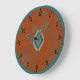 Inspired by the turquoise and copper verdigris colors and geometric designs distinctive to the artist's surroundings in the desert southwest. Arizona, Santa Fe, Southwest, Desert, and Lodge style design. Old West style numbers on clock face.