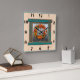 This design features a colorful chile pepper wreath tied with a raffia bow on a rustic wooden window in an old adobe house. This clock has a basic style of numbers on the face. The original painting was inspired by the chile ristras and wreaths the artist hung at her home in New Mexico. Ristras are a symbol of welcome said to bring good health and good luck.