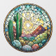 Transform your windows into a stunning work of art with our stained glass cactus window cling. Featuring a vibrant desert scene complete with a radiant sun, majestic mountains, and serene cacti, this round glass decal emulates the beauty of a real stained glass panel with the ease of a removable suncatcher. Perfect for adding a splash of color to any room and easy to apply to any glass surface without the use of adhesives.