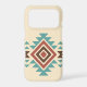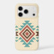 A Southwestern-style geometric pattern featuring layered diamond shapes in warm terracotta, deep brown, and cool turquoise tones. The distressed texture gives it a vintage feel, while the symmetrical layout adds a clean and modern touch.