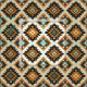 The image is a digital graphic designed as a repeating pattern or background. It features a geometric design with a distinct Southwestern or Native American-inspired aesthetic. The pattern consists of repeating diamond and star-like shapes arranged in horizontal and vertical rows. The color palette is warm and earthy, with prominent use of orange, brown, teal, and cream. The geometric elements incorporate stepped patterns and angular lines, characteristic of traditional Southwestern textiles and art. The overall style is bold and visually striking, suggesting themes of tribal patterns, ethnic designs, and possibly cultural heritage.