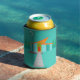 This Personalized Space Age Cartoon House Can Cooler is a retro lover’s dream come true. The minimalist art design features an aqua stone house with large, peacock blue windows. Hanging from the atomic, slanting, orange roof, a yellow sputnik light fixture illuminates the front door. The recessed red front door with starburst doorknob is beautifully offset by the vertical green wood planks of the exterior entryway. A gray stone path cuts across the pristine lawn, which appears turquoise in the moonlight. Behind the house, a row of a tall, thin, trees point to the turquoise sky and the white silhouette of a full moon. While no people are visible, on a night like this, the kitschy house’s inhabitants are probably inside watching news footage of the astronauts. Customize with a name for a one of a kind gift.