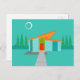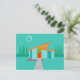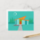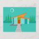 This Space Age Cartoon House Postcard is a retro lover’s dream come true. The minimalist art design features an aqua stone house with large, peacock blue windows. Hanging from the atomic, slanting, orange roof, a yellow sputnik light fixture illuminates the front door. The recessed red front door with starburst doorknob is beautifully offset by the vertical green wood planks of the exterior entryway. A gray stone path cuts across the pristine lawn, which appears turquoise in the moonlight. Behind the house, a row of a tall, thin, trees point to the turquoise sky and the white silhouette of a full moon. While no people are visible, on a night like this, the kitschy house’s inhabitants are probably inside watching news footage of the astronauts.