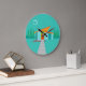 This Space Age Cartoon House Round Acrylic Wall Clock is a retro lover’s dream come true. The minimalist art design features an aqua stone house with large, peacock blue windows. Hanging from the atomic, slanting, orange roof, a yellow sputnik light fixture illuminates the front door. The recessed red front door with starburst doorknob is beautifully offset by the vertical green wood planks of the exterior entryway. A gray stone path cuts across the pristine lawn, which appears turquoise in the moonlight. Behind the house, a row of a tall, thin, trees point to the turquoise sky and the white silhouette of a full moon. While no people are visible, on a night like this, the kitschy house’s inhabitants are probably inside watching news footage of the astronauts.