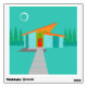 This Space Age Cartoon House Wall Decal is a retro lover’s dream come true. The minimalist art design features an aqua stone house with large, peacock blue windows. Hanging from the atomic, slanting, orange roof, a yellow sputnik light fixture illuminates the front door. The recessed red front door with starburst doorknob is beautifully offset by the vertical green wood planks of the exterior entryway. A gray stone path cuts across the pristine lawn, which appears turquoise in the moonlight. Behind the house, a row of a tall, thin, trees point to the turquoise sky and the white silhouette of a full moon. While no people are visible, on a night like this, the kitschy house’s inhabitants are probably inside watching news footage of the astronauts.