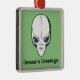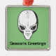 This square metal Christmas ornament is the perfect fusion of festive holiday spirit and extraterrestrial mystery, featuring the unmistakable head of a classic space alien with its large black eyes and enigmatic expression, set against a vibrant green background with the words “Season’s Greetings” displayed below. Whether you’re a dedicated ufologist, a UFO enthusiast, or simply someone who loves science fiction and all things intergalactic, this unique holiday decoration is an ideal way to bring a little out-of-this-world charm to your Christmas tree. The design pays homage to the countless reports of flying saucers and extraterrestrial encounters, making it a fun and quirky addition to any collection of Christmas decorations. While traditional holiday ornaments tend to feature reindeer, snowmen, and Santa Claus, this one takes a different approach, embracing the mystery and wonder of the cosmos while spreading seasonal cheer.