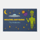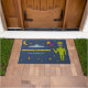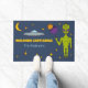 Add a personalized touch to your entryway that's uniquely you. This welcome mat features illustrations of lime green space aliens, a ufo or flying saucer, stars, moon and planets and is ready to be personalized with a name and your own custom welcome message.