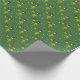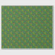 Season’s Greetings, Earthlings! This festive Christmas wrapping paper features illustrations of little green men wearing red Santa hats with some holiday globe ornaments that look like planets with white stars against a green background.