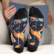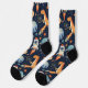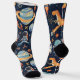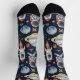 A blue pattern-based sock design with space and dinosaur themed drawings. Great for cozy moments and sci-fi lovers.