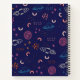 This custom notebook features a cute space themed doodle art pattern with planets, rocket ships, and abstract shapes on a dark navy blue background. Personalize it with your name. Great gift idea!