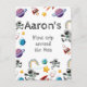 Outer space first birthday party invitations featuring a starry sky background, planets of the solar system scattered around the edge, a rocket ship, astronaut, and a modern 1st birthday celebration template that is easy to personalize.